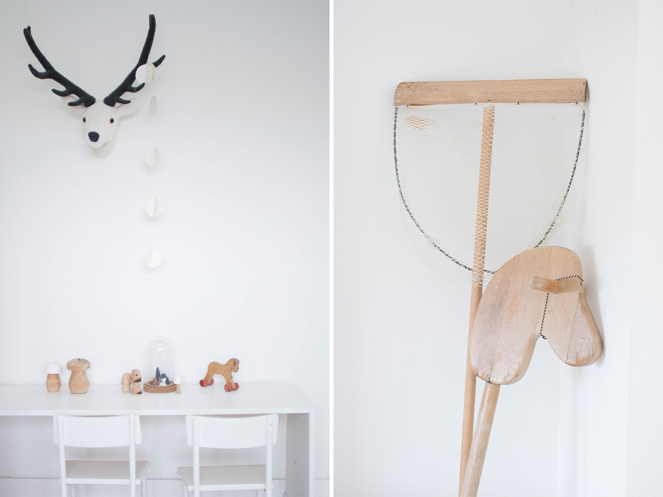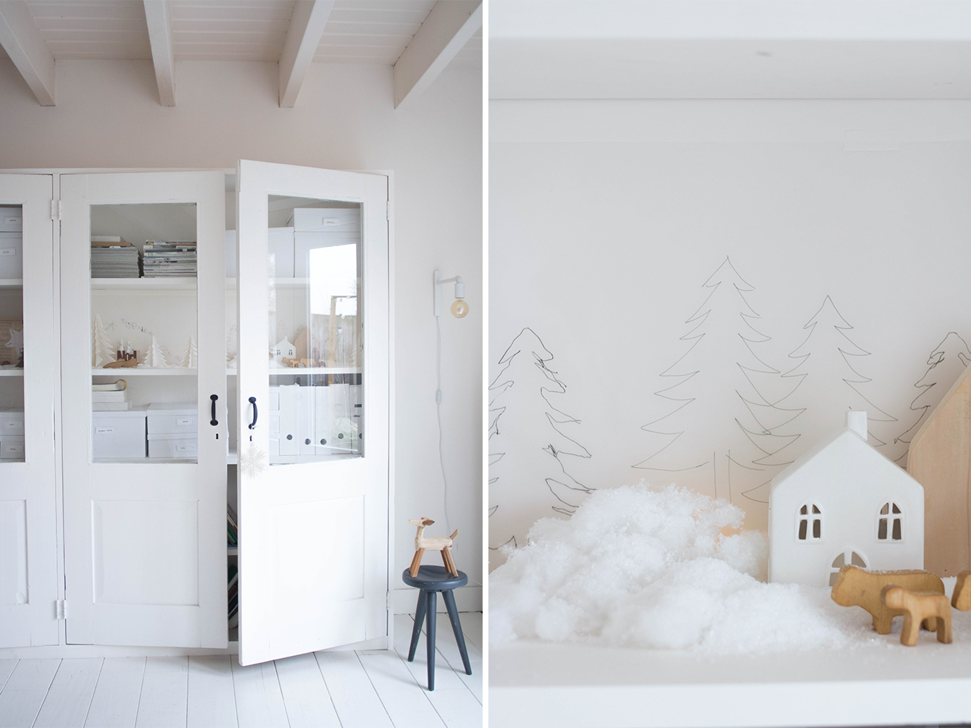 In de grote witte kast die Gerben en Dita zelf maakten bergen ze alle boeken en andere spullen op die ze liever niet in het zicht hebben – alles staat er keurig in witte dozen. In de kast staat nu een prachtig kersttafereel met een stal, lichtjes en mooie decoraties. De schommelstoel vond Dita op Marktplaats, net als het krukje dat ze zwart verfde. Het houten hertje dat erop staat is van quip & Co en het lampje naast de kast is van Karwei.