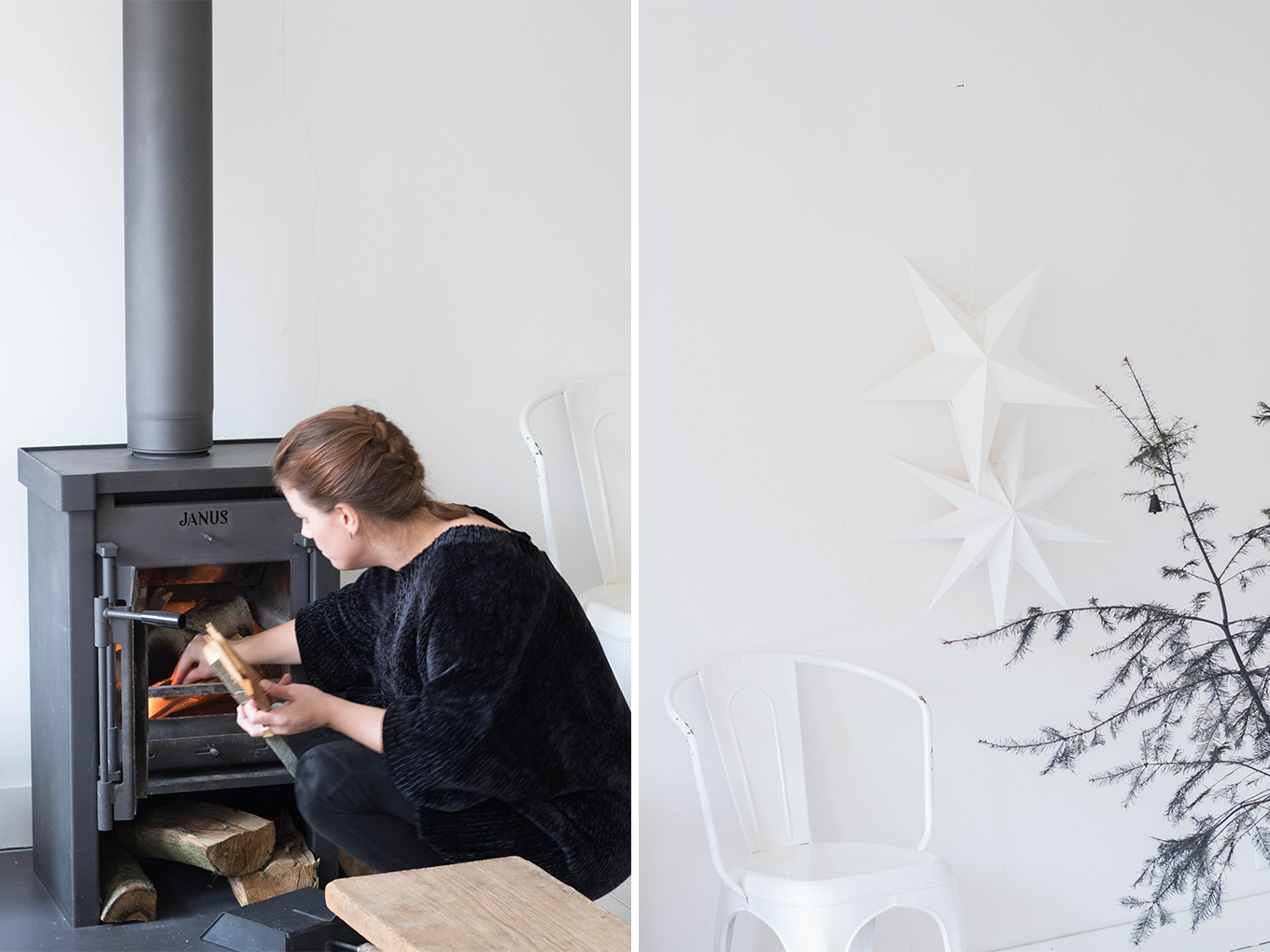 De woonkeuken en het zitgedeelte op de benedenverdieping worden gescheiden door een gang, met schommel. Achter de deurtjes bevinden zich de badkamer, bijkeuken, twee kasten en een toilet. Het zitgedeelte ligt aan de achterkant van het huis en ook hier is weer een fijne houtkachel. De ‘kerstboom’ maakte Dita zelf van takken van jonge boompjes die ze een likje zwart verf gaf. Ze zette de takken in een grote pot met aarde en klaar was de minimalistische kerstboom.