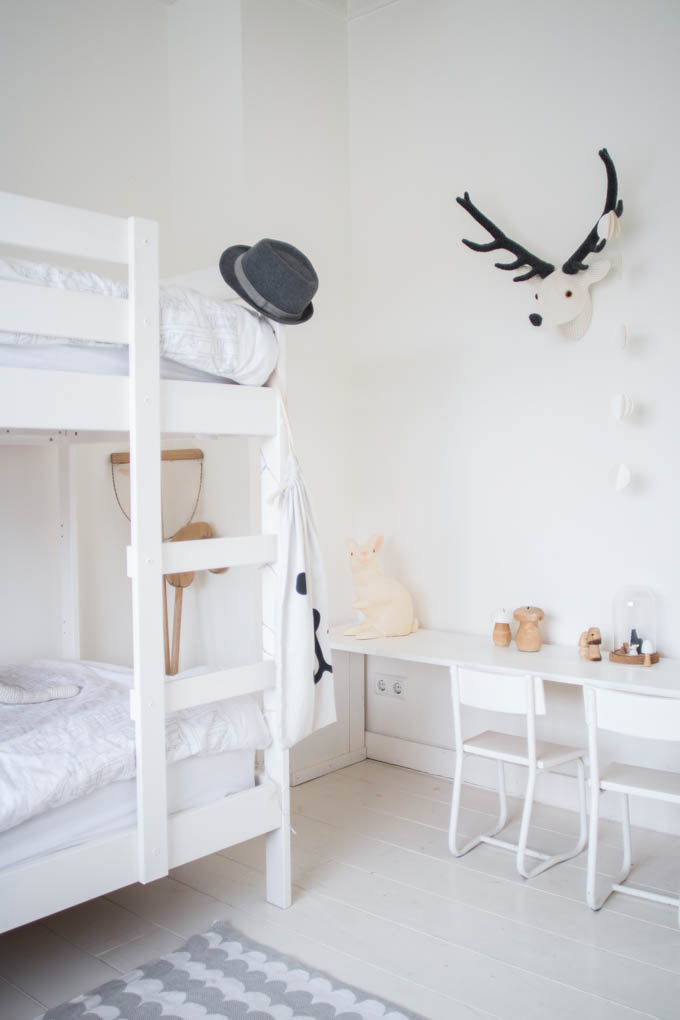 Op de bovenverdieping bevinden zich drie slaapkamers. De ouderslaapkamer, de kamer van de oudste kinderen, Bob en Fien, zij slapen samen in een stapelbed en Kaat heeft haar eigen kamertje. De slaapkamers van de kinderen zijn, net als de ouderslaapkamer, wit. Op de kamer van Bob en Fien zijn fijne inbouwkasten voor speelgoed en kleding. Met wat houten accenten en een klein kerstboompje is de slaapkamer heel sfeervol. Op het kamertje van Kaat heeft Dita één wand geverfd met zwarte krijtverf. Een mooi contrast met al het wit. De kasten op de ouderslaapkamer zijn van Ikea en verfde Dita zelf wit. Door ook een greepje toe te voegen en de kasten hoog op te hangen zijn ze bijna onherkenbaar geworden – tenminste, ik zag niet direct dat het Ikea-kasten zijn. In de slaapkamer voegde Dita een zwart accent toe met kandelaars voor een mooi contrast.