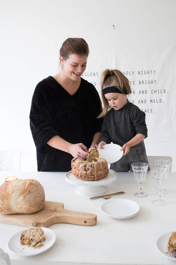 Tussen de middag genoten we van een heerlijke lunch met vers brood, een lekkere tulbandcake én bubbels. Zo kwamen we al lekker in een feestelijke kerstsfeer. Fien hielp goed met het snijden en delen van de cake, elke stoel kreeg een schoteltje – alsof we écht een feestje hadden! Het canvasdoek met tekst aan de wand achter de eettafel bedacht Dita zelf en werd uitgevoerd door Maakt-blij.